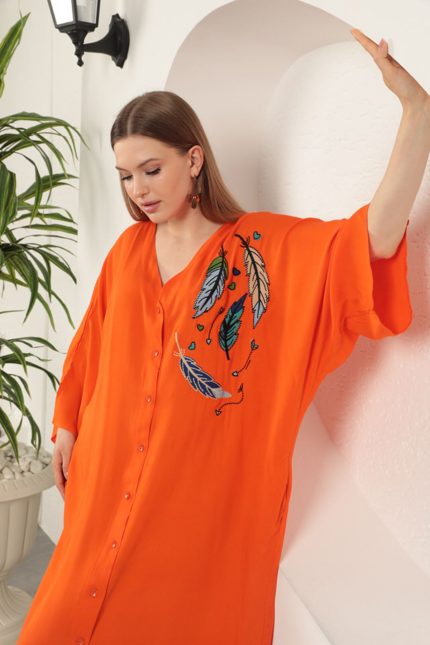 Viskon Yaprak Nakışlı Elbise-Oranj